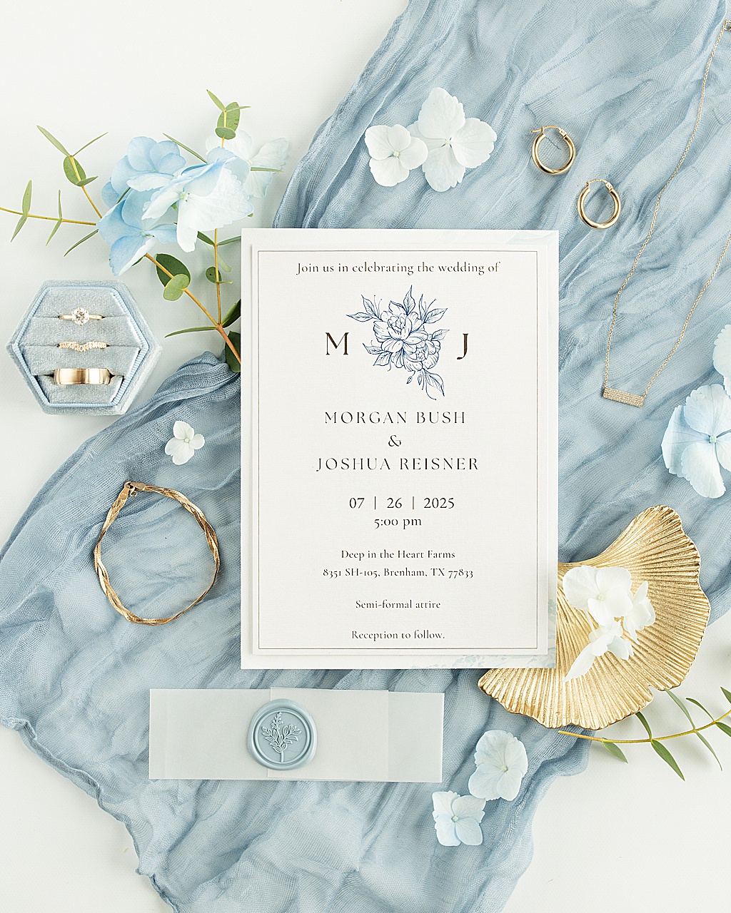 This summer wedding at Deep in the Heart Farms in Brenham, TX was the perfect blend of elegance, faith, and Texas charm. Joshua & Morgan chose a timeless palette of dusty blue, white, and greenery, creating a soft, romantic feel throughout the day. The bride’s look was effortlessly classy, her style refined yet radiant, even under the Texas heat.